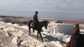 Bust or Boom Live took place as a 12-hour performance piece filmed on location at Lake Tyrell in Central Victoria. The work, conceived and developed by Helen Mathwin, focused on a lone man who rode for 12 hours across a harsh, striking, salt -lake beach, ending on top of a salt mountain. The landscape is one of extremes- an expansive white foreground and powdery blue-sky contrast sharply with the black horse that picks it way across the salt, scrub and sand. There is sense of desolation, of thirst and desperation that is perpetuated by the pressing wind and sun.