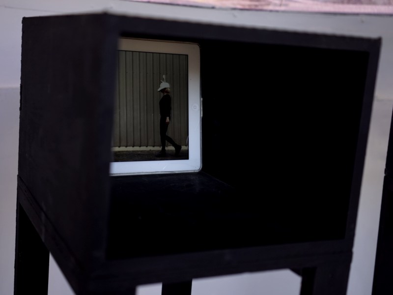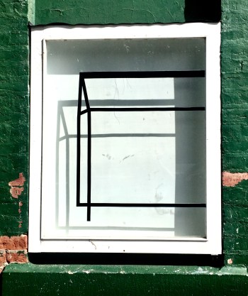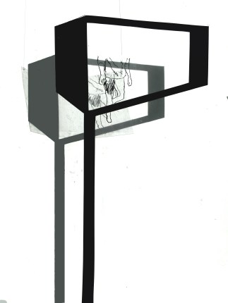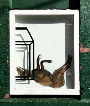 Linear Response draws on TUESDAY WHEN I FOLLOWED 2017. Here the familiar symbol of house/ house is troubled by the image on the far left, evocative of a camera, a distorted figure lightly sketched with. The lifeless dog on the right draws the eye as the only colour in the work, despite this the posture of the animal further unsettles this simplified representation of home. The black lines within this work are made of gaffe tape stretched internally across the windows at Wide Open Road Art. The moving sun ever-present in this public, outdoor location became important to the work as the lines doubled, strengthened, faded, moved throughout the day.